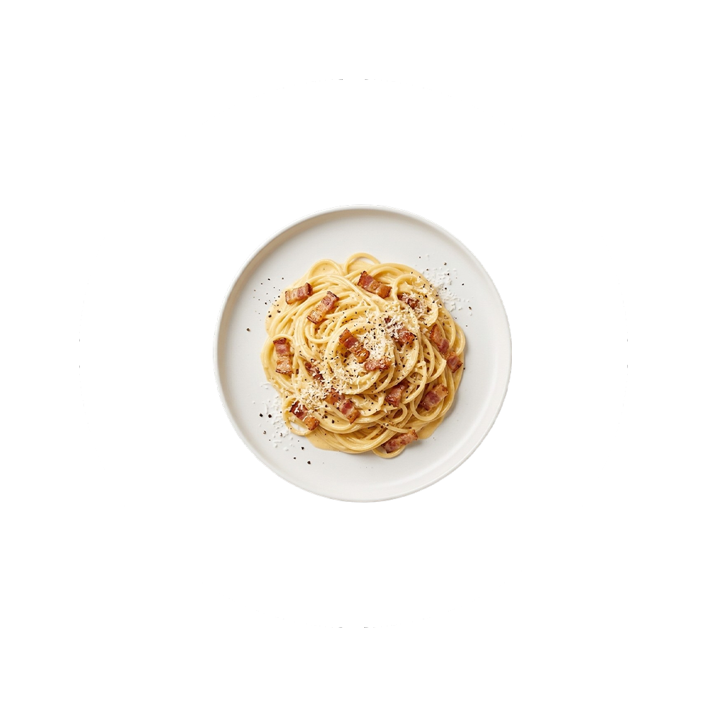Zubereitet mit Rahm, Eigelb, Speck und Parmesan