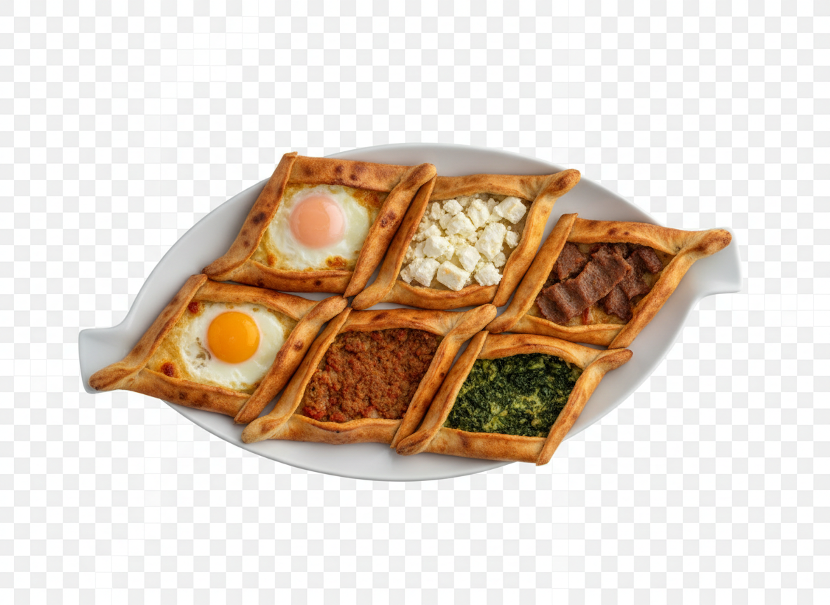 Wahl aus: mit Ei, mit Feta, mit Hackfleisch, mit Kebabfleisch, mit Knoblauchwurst, mit Spinat und mehr.