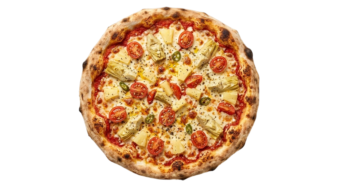 Tomaten, Mozzarella, Oregano und 5 weitere Zutaten nach Wahl: Ananas, Artischocken, Chili, Cocktailsauce, Extra Mozzarella und mehr.
