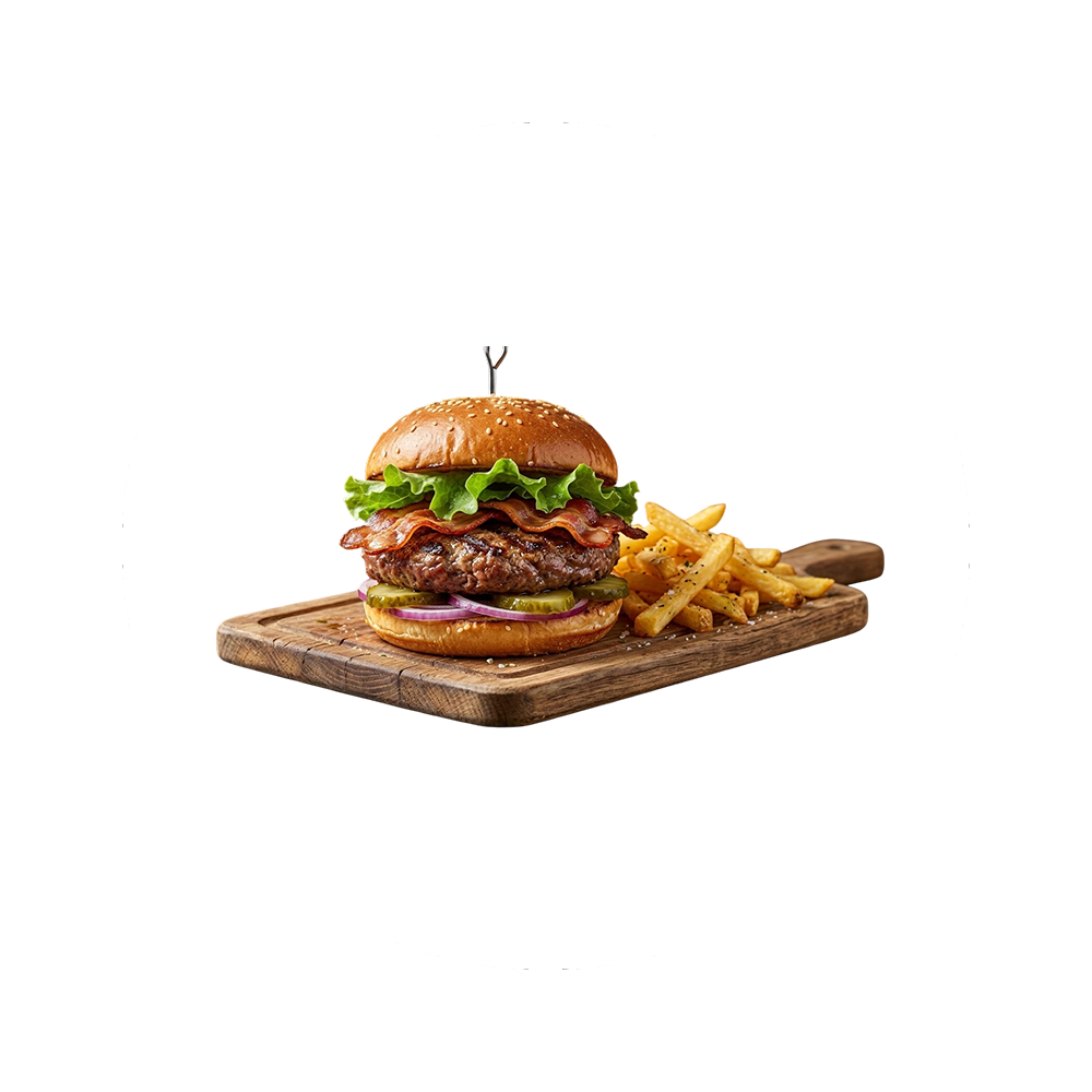 Zubereitet mit Rindfleisch, Speck, Salat, Essiggurken und frische Zwiebel